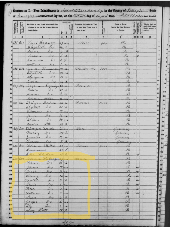 According to the 1914 History of Lehigh County, Solomon’s father was Henry Steckel. Henry was the third son of Johan Peter Steckel and was born in 1756.