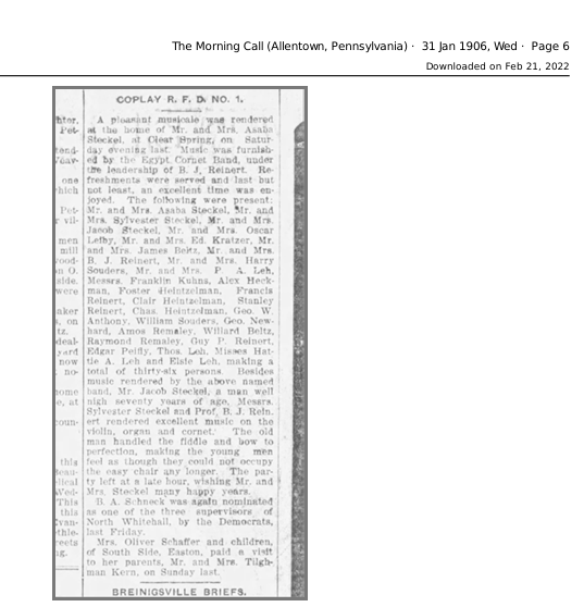 I was also able to find a fun little tidbit about Jacob Steckel in the Morning Call Newspaper. In 1906, Jacob’s son Asaba and his wife held a musicale night and had the Egypt Cornet Band over to play a concert in their home, but the highlight of the night was Jacob who played his violin while two other men played the cornet and the organ. Although Jacob was over 70 years old at the time, “the old man handled the fiddle and bow to perfection, making the young men feel as though they could not occupy the easy chair any longer.”